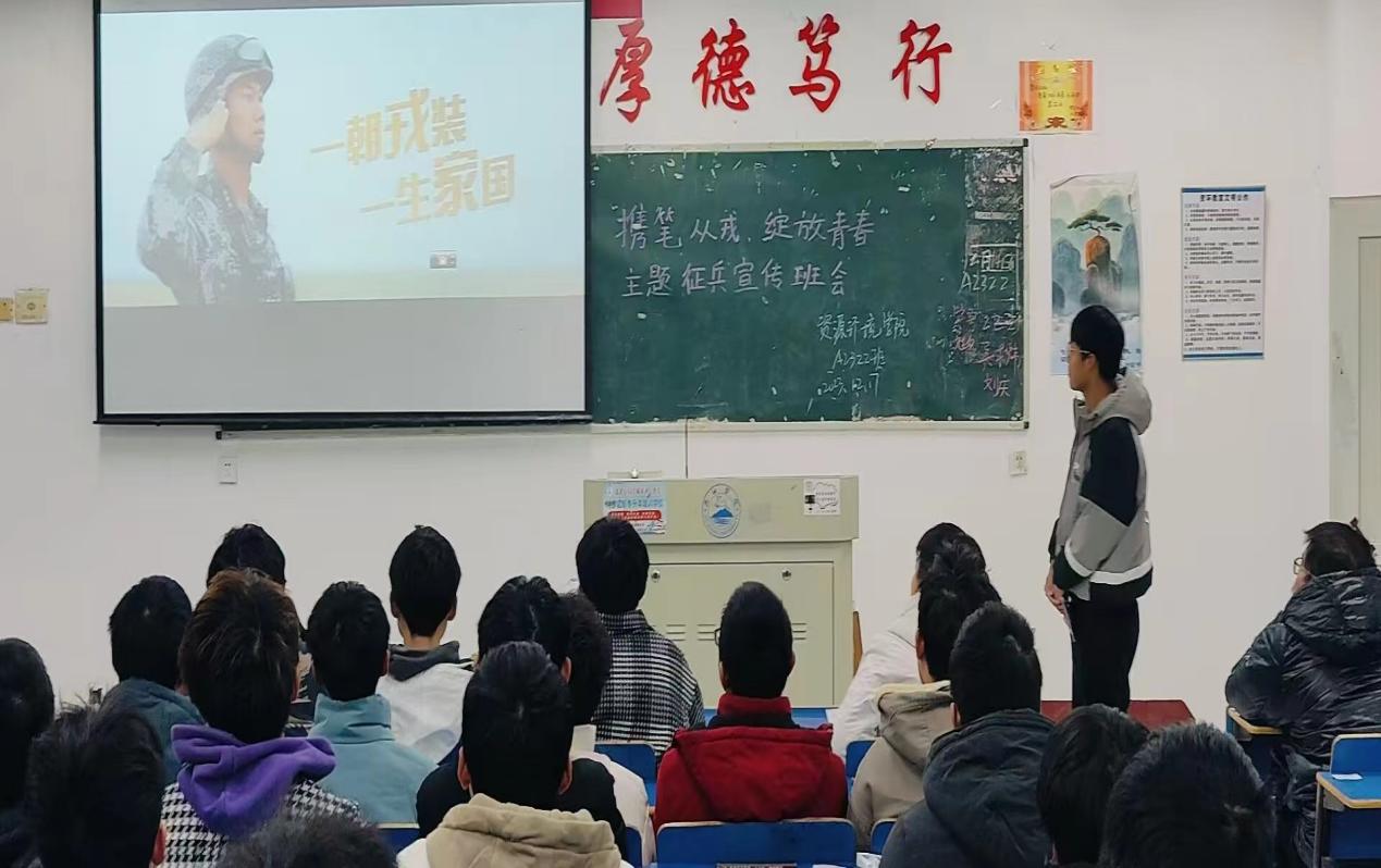 为落实leyu乐鱼在线登录入口《关于组织开展2024届的毕业生“携笔从戎、绽放青春”主题征兵宣传活动的通知》(九院学字[2023]48号)文件精神,进一步激发学生的参军报国热情,leyu乐鱼在线登录入口于12月18日晚上组织各班级开展了“携笔从戎,绽放青春”主题征兵宣传班会。