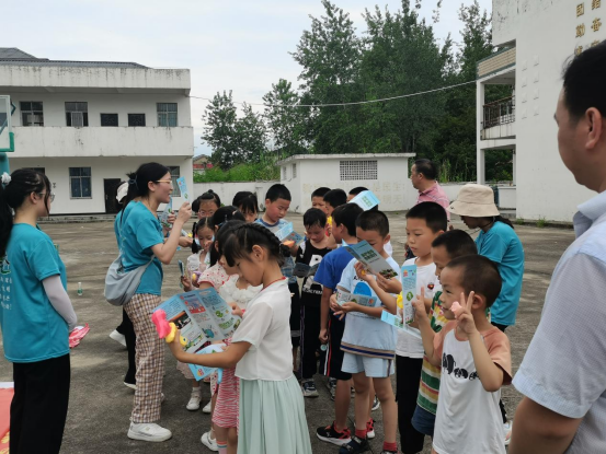 (队员给小朋友们发放宣传手册及玩具)