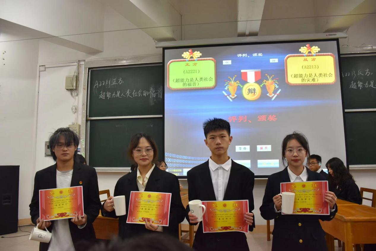 经过初赛和复赛的评选,最终进入决赛的两个班级是A2221班和A2213班。双方通过抽签决出正方A2221班的辩题是“超能力是人类社会的福音”,反方A2213班的辩题是“超能力是人类社会的灾难”。主席宣布比赛开始后,双方一辩先后发表陈词论述己方观点并接受质询,其后双方辩手针锋相对,你来我往,却又不失风度,侃侃而谈。在最精彩的自由辩论环节中,双方辩手自由发挥,唇枪舌战,在激烈交锋中不停深入探讨超能力基于现实生活和人类发展的影响及意义。现场气氛迅速升温,精彩连连掌声不断。自由辩结束后正反方四辩依次总结陈词,梳理战场,从价值层面上引发新的感悟和思考。