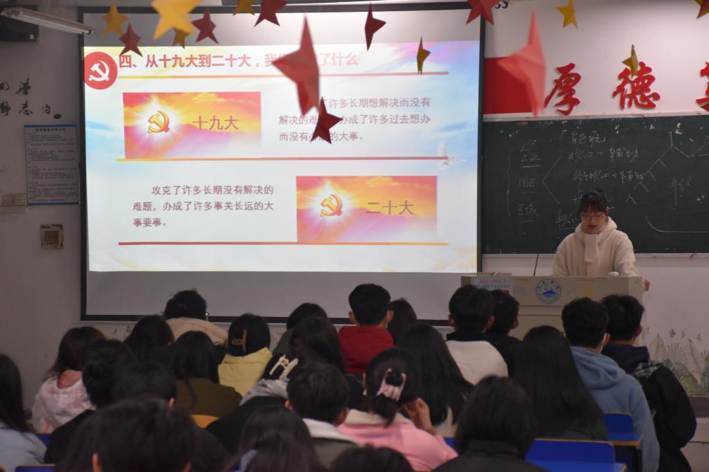 为深入学习贯彻习近平新时代中国特色社会主义思想,认真贯彻落实《中共中央关于认真学习宣传贯彻党的二十大精神的决定》,leyu乐鱼在线登录入口于12月6日晚在香远楼405教室举行“永远跟党走,奋进新征程”二十大学生宣讲活动,此次活动由leyu乐鱼在线登录入口宣讲团杨斐斐同学宣讲。