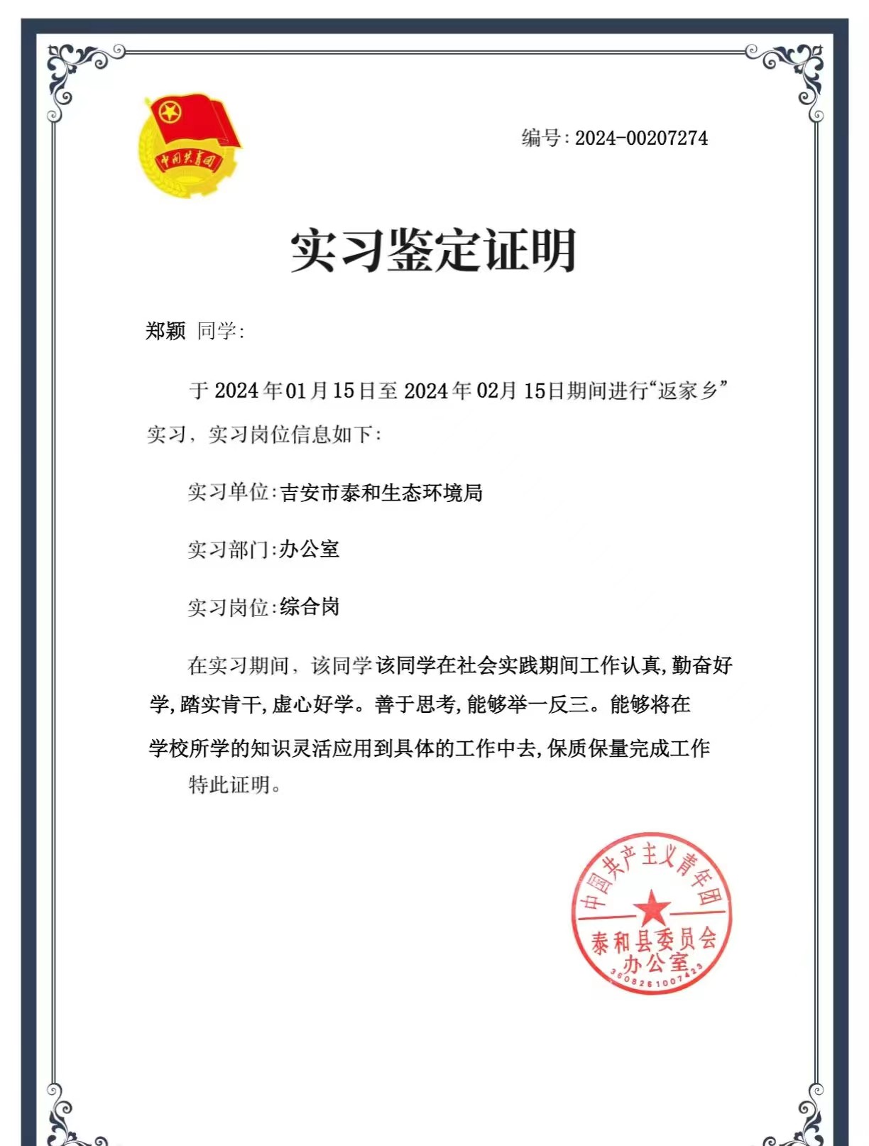 为更好地助力青少年健康快乐成长,寒假期间,团红谷滩区委、九龙湖街道团工委、安丰花园社区团支部组织“青英归巢“返乡大学生志愿者开展”缤纷冬日,快乐成长”寒假小课堂活动。leyu乐鱼官网志愿者惠琬欣积极响应号召。郑颖同学于吉安市泰和生态环境局实习。在实践中,通过切身体会,加深了对环境监测保护的工作和职责的认知,并对其在国家机关中的重要作用有了深刻理解。通过实习,郑颖同学增长了自己的见识,提升了自己的才能,培养了自己的韧性,受益匪浅。