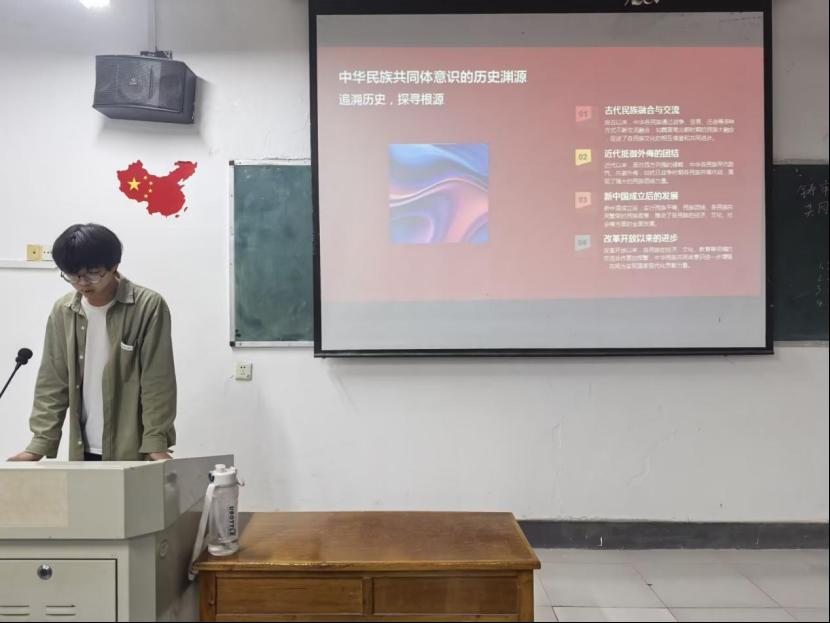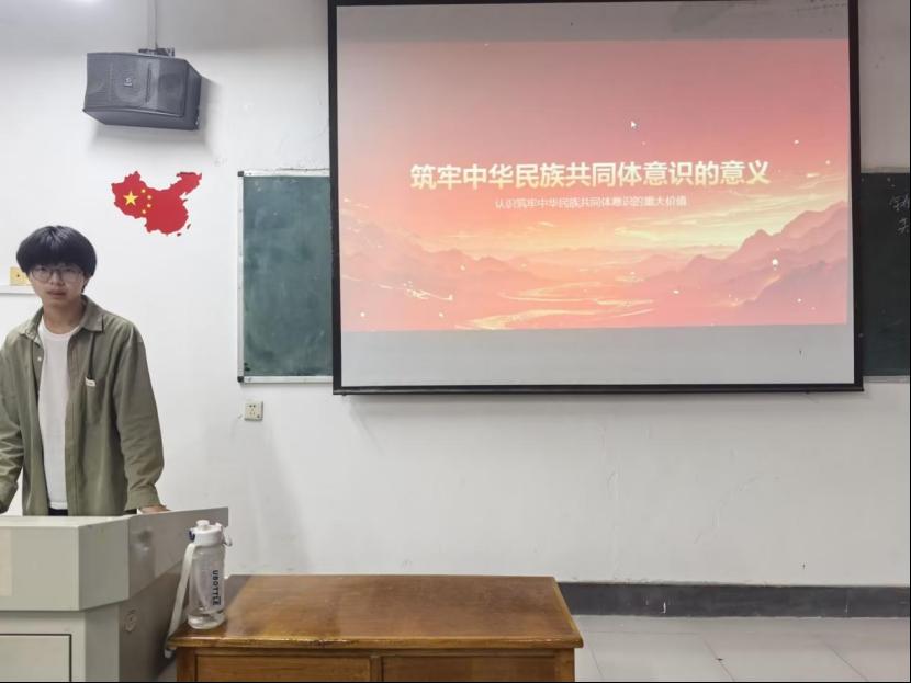在齐唱团歌结束过后,团日活动准时开始。各班团支书和组织委员组织各班开展“铸牢中华民族共同体意识”团日活动,主讲人围绕中华民族共同体意识的概念、提出背景、重要意义以及在新时代的具体实践,让同学们意识到,作为中华民族的一员,我们应该有共同的理想、信念和追求,共同维护国家的统一和民族的团结。
