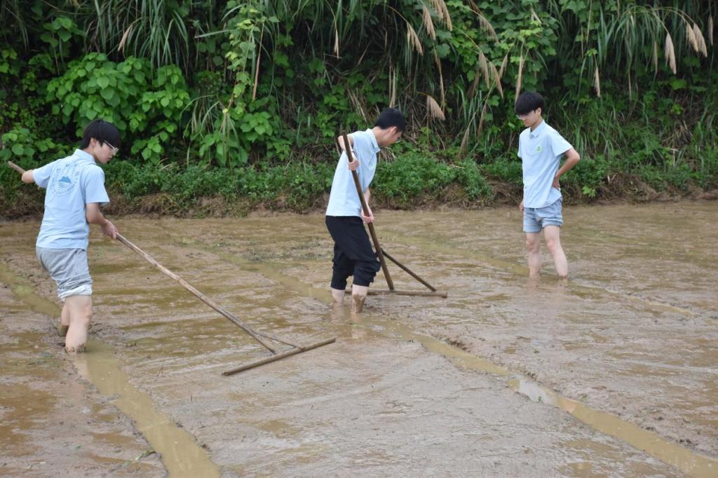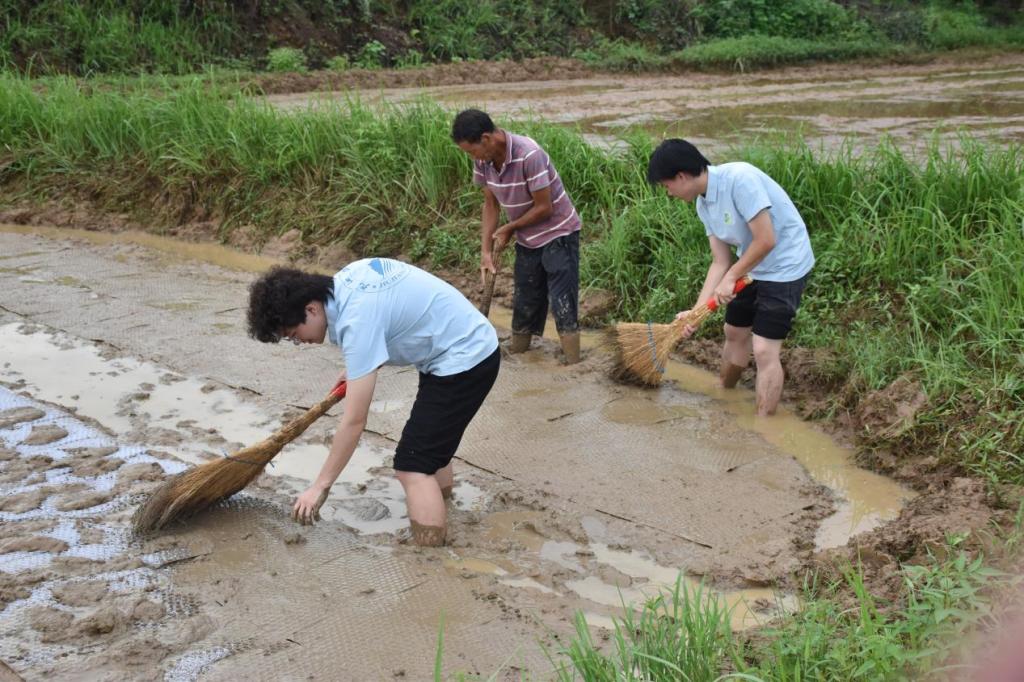 6月26日,实践队在东山村深入农耕一线,队员们踏入泥泞水田,分组协作进行平田备耕。一组弓腰持木耙,细致打碎泥块、抹平田面;另一组认真清理田中育秧设施。汗水浸透衣衫间,队员们切身体悟“粒粒皆辛苦”。旋即投身“守护绿水青山”环境保护志愿服务活动中,分组清理村道、河道及公共区域垃圾,村容焕新;同时向村民宣讲垃圾分类、秸秆禁烧知识,倡导绿色生活。