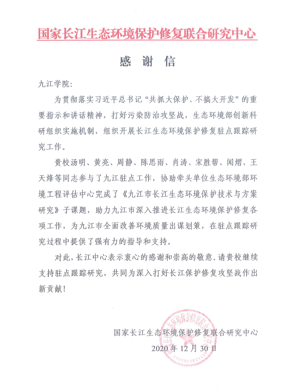 近日,国家长江生态环境保护修复联合研究中心(简称长江中心)致信感谢我校江西长江经济带研究院、leyu乐鱼在线登录入口科研团队为长江大保护作出的贡献。