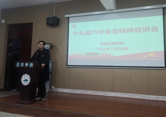 为深入学习宣传贯彻党的十九届六中全会精神,12月16日下午,在向学楼201会议室,leyu乐鱼在线登录入口邀请马克思主义学院黄群副教授为师生作了题为“十九届六中全会精神解读”的专题宣讲报告。学院领导及全体教师、部分学生参加了宣讲会,资环学院党委副书记张杨帆主持会议。