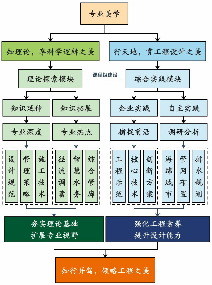 充分挖掘本地课程思政素材,借助“理论探索”和“综合实践”双模块打通思政与专业的融合通道,形成“排水工程理论教育-工程实践能力提升-生态文明工程美学鉴赏”的思政特色。